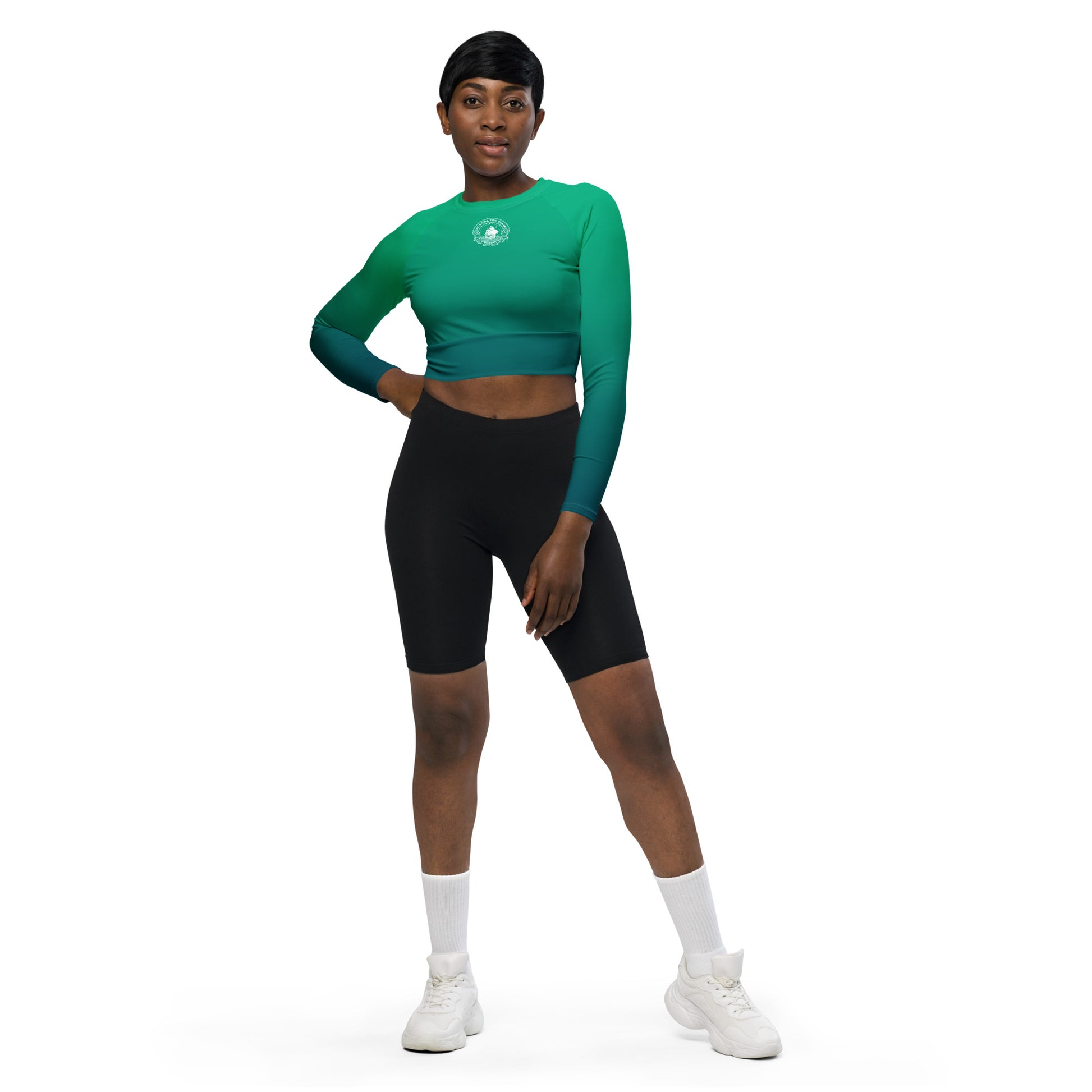 This long-sleeve crop top is made of recycled polyester and elastane, making it an eco-friendly choice for swimming, sports, or athleisure outfits. The crop top has a tear-away care label and a wide, double-layered waistline band for a comfortable fit.